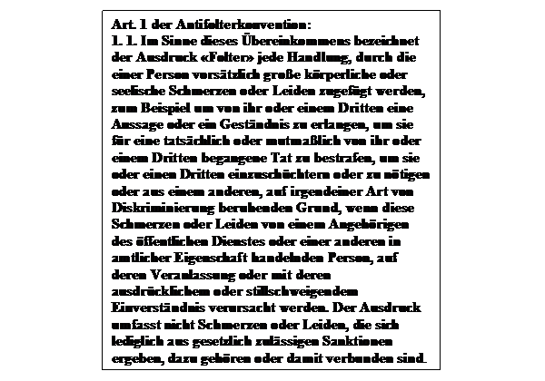 Wenn es um die Frage von Folter in der DDR geht, dann kann nur die völkerrechtliche Definition zur Grundlage der Beurteilung genommen werden. Auf eine klare Definition der Folter konnte sich die UNO erst 1984 mit der UN-Antifolterkonvention verständigen. Die DDR ratifizierte diese Konvention am 9. September 1987. Die Bundesrepublik Deutschland wurde erst mit der deutschen Einheit zur Ratifizierung gezwungen und tat dies am 1. Oktober 1990.